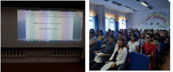 Жамбыл атындағы гимназияда 10 қыркүйек күні «Қауіпсіз мектеп» акциясына байланысты іс-шара жоспары құрылып,бекітілді.Жоспарға сәйкес 6 қыркүйек күні мектеп психологтары мектепте бопсалау және басқа қылмыстық фактілерді анықтау бойынша оқушылар арасында сауалнама жұмыстарын жүргізді.ОӘЖ орынбасары Тұрсынова Г.О. «Қауіпсіз жүру ережелерін» ата-аналарға арналған ақпараттық жадынамаларды тарату,ақпараттандыружұмыстарын жүргізді.