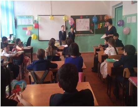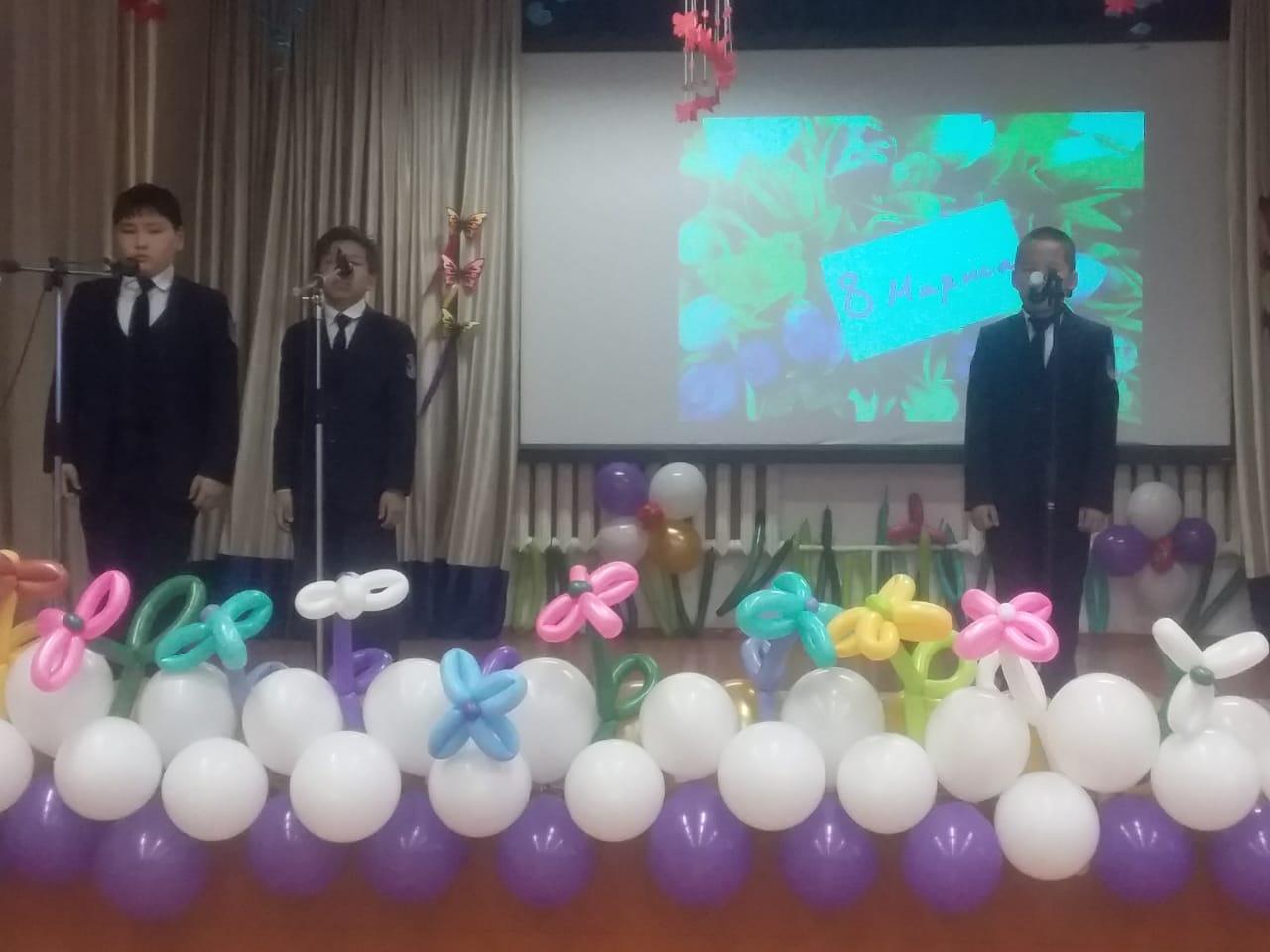 Ана жайлы тамаша сөздер, өлеңдер, әндер арқылы аналар мен аруларды мерекемен құттықтау, оқушыларды мейірімділікке ,ұстамдылыққа тәрбиелеу, ұстазға, ата-анаға деген құрмет сыйын арттыру, ана еңбегін қадірлей білуге үйрету мақсатында сынып жетекшілер сынып сағатын өткізді. «Жас Ұлан» ұйымының мүшелері, 9 «Г» сынып оқушылары мен сынып жетекшісі Саленко Н.А. ұйымдатыруымен 6 наурыз күні «Әлемнің жарығын сйладың сен маған» атты концерт бағдарлама өткізілді. Концертік бағдарламаға мектепбіміздің өнерлі оқушылары қатысып, аналары мен ұстаздарға жылы лебіздерін білдіріп мерекемен құттықтады.