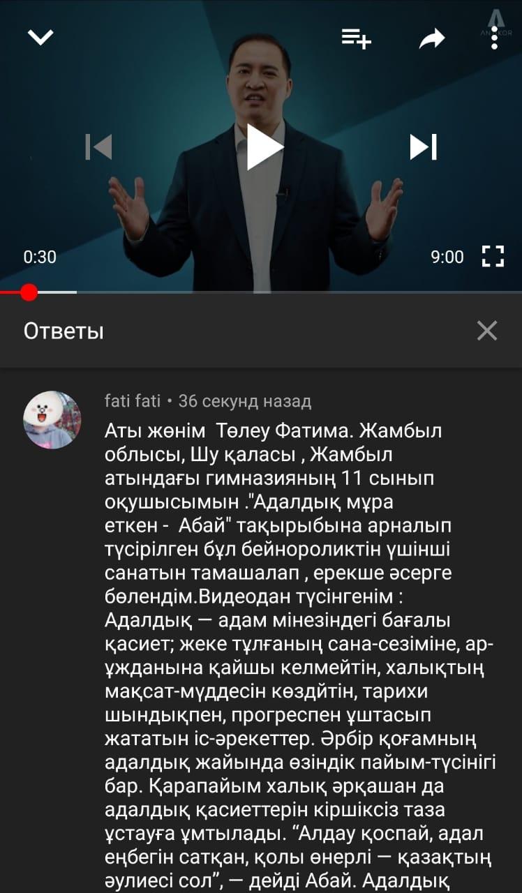 18 мамыр күні Ұлы Абайдың 175 жылдық мерейтойына орай өткізілген "Адалдықты мұра еткен Ұлы Абай" тақырыбынында Ғанижан Асанұлының жасаған видеоролигі көрсетіліп, адалдық сағаты өтті. Гимназия білім алушылары видеороликті талқыға салып, өз ойларымен бөлісті. Осындай видеороликтердің пайдасы қоғамда көрініс беріп қалатын сыбайлас жемқорлыққа қарсы күресе білетін  жас ұрпақты адалдыққа тәрбиелеу. "Ақырын жүріп анық бас, еңбегің кетпес далаға" деген үндеу дерлік нақыл сөзі адамның адамшылығының неден басталатынын аңғартады емес пе? Дәлірек айтқанда, сабақ ұлы ойшылдың өлеңдері мен қара сөздерінде көрініс тапқан адалдықтың рухымен саналы ұрпақ тәрбиелеуге бағытталған.