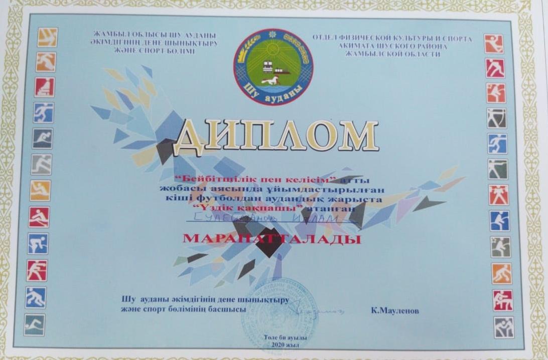Жамбыл атындағы гимназия оқушысы Сүлейманов Ислам Жамбыл облысы Шу ауданы әкімдігінің дене шынықтыру және спорт бөлімі "Бейбітшілік пен келісім" атты жобасы аясында ұйымдастырылған кіші футболдан аудандық жарыста "Үздік қақпашы" номинациясымен марапатталды.