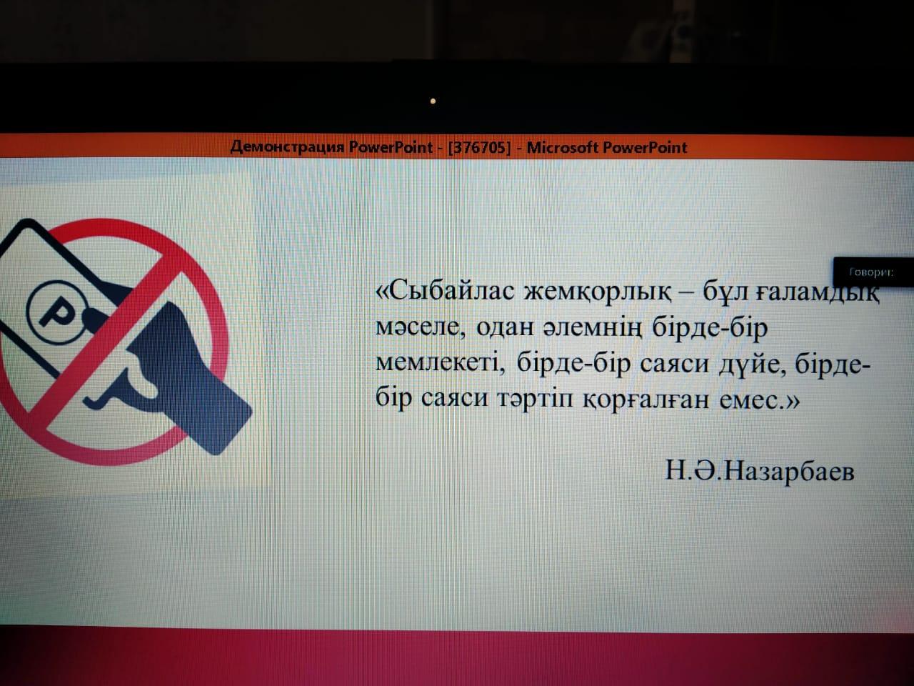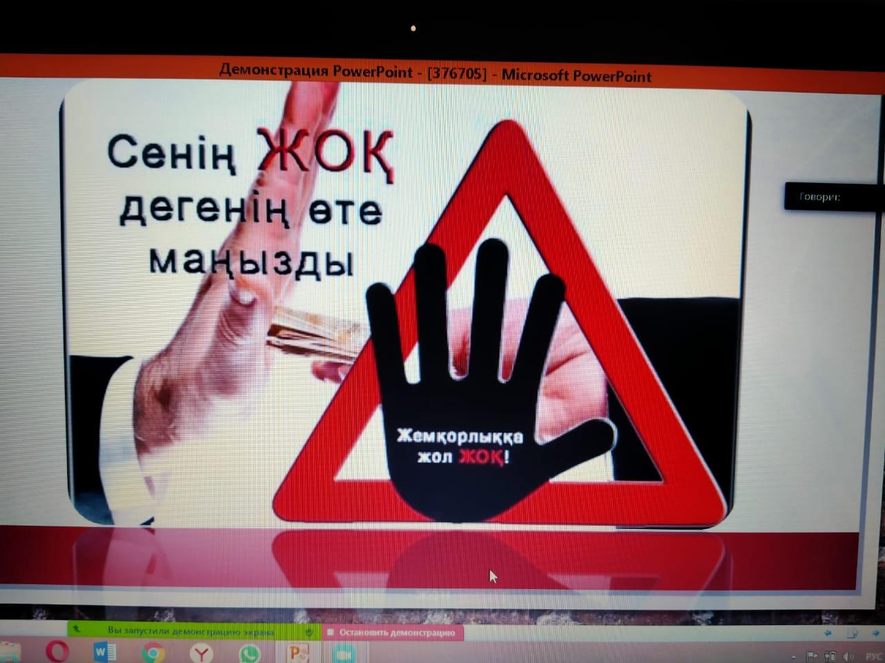 Құқық бұзушылықтың алдын алу мақсатында 2020-2021 жылдың   жоспарына сәйкес, Жамбыл атындағы гимназияның 8 «А» сынып жетекшісі Примкулова Айгерим Абайдулаевна 8 «А» сыныбының оқушыларымен «Біз жемқорлыққа қарсымыз!» тақырыбында онлайн форматында тәрбие сағатын жүигізді.