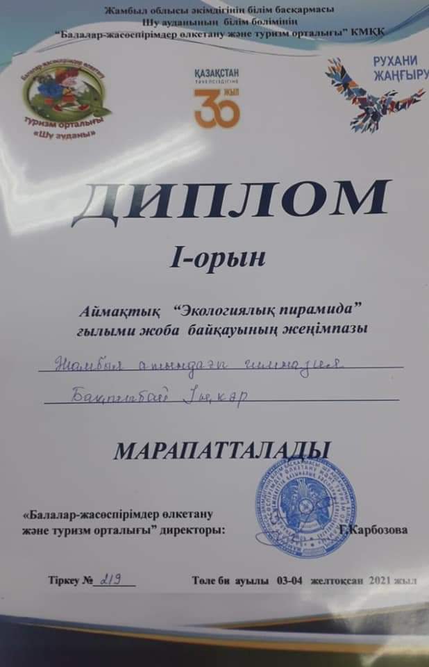08 декабрь 2021 0 1 2 3 4 5 Бақтыбай Іңкәр І дәрежелі дипломмен марапатталды Аймақтық “Экологиялық пирамида" ғылыми жоба байқауының жеңімпазы Бақтыбай Іңкәр І дәрежелі дипломмен марапатталды
