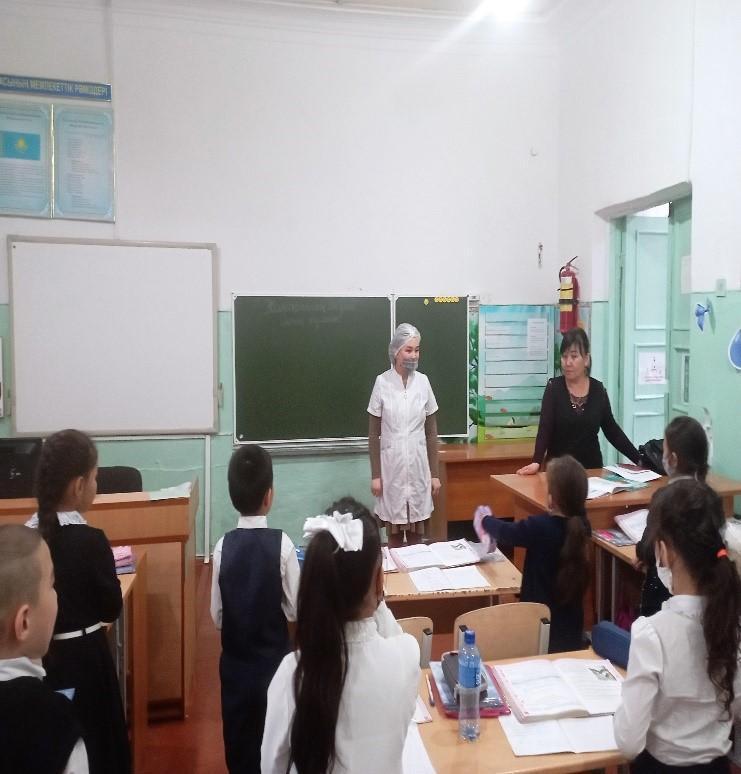 Гимназия медбикесі 5 сыныптарға «Ыстық тамақтың оқушы денсаулығына пайдасы» тақырыбында баяндама оқыды. Дұрыс тамақтану туралы оқушыларға түсіндірме жұмыстарын жүргізді.Тамақтану барысымен таныстырып өтті.Оқушылар өз ойларымен бөлісіп, сұрақтар қойып,жауаптарын алды.